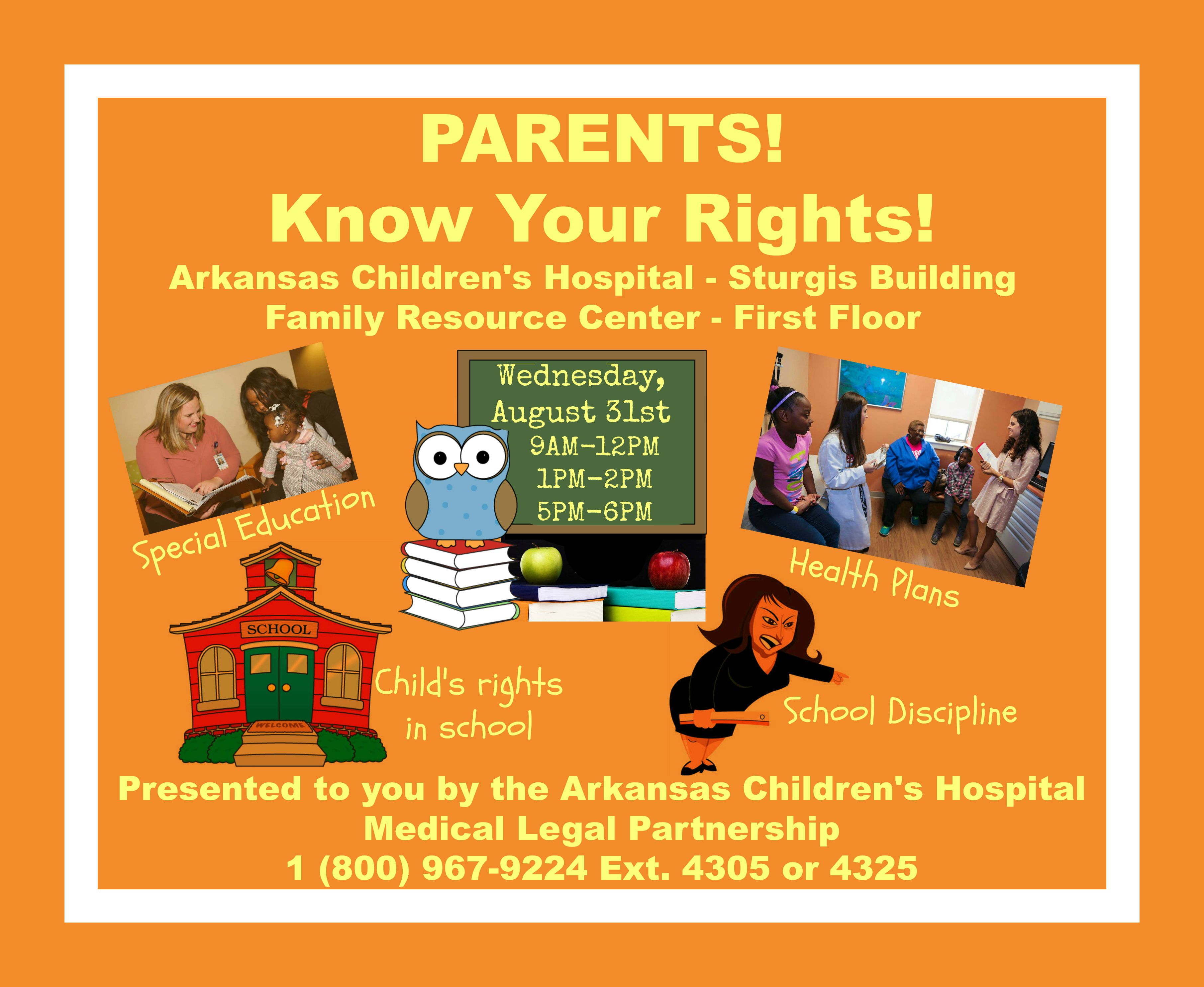 Please join us for a parent teaching course on special education and related services on August 31st in the Family Resource Center at Arkansas Children's Hospital in Little Rock. The times are as follows: