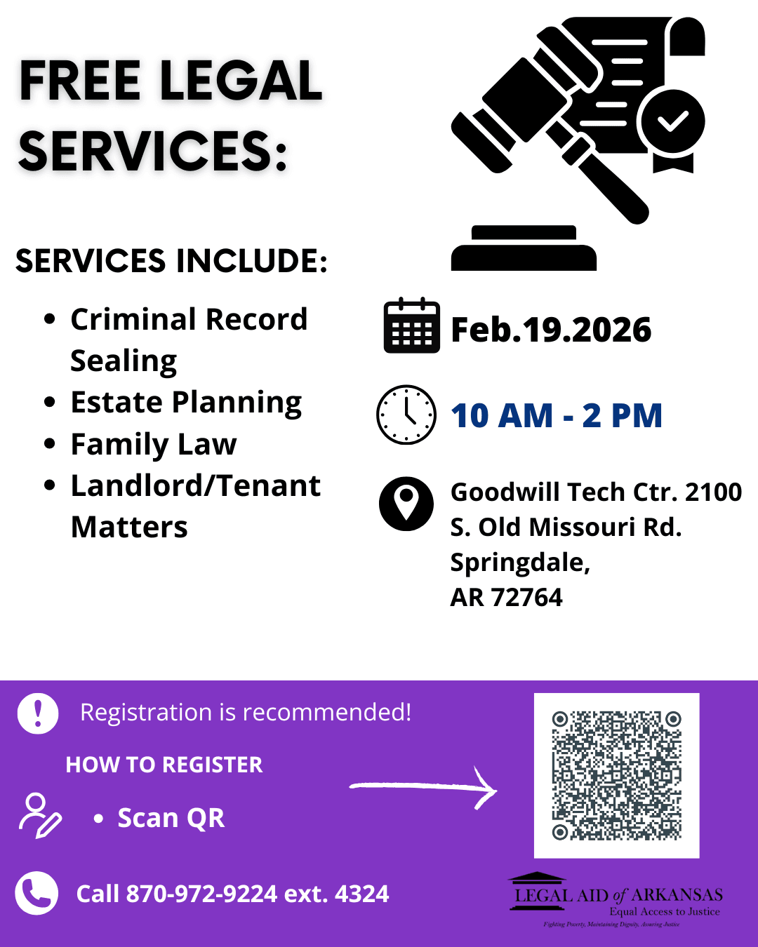 Free legal clinic for low-income Arkansans.